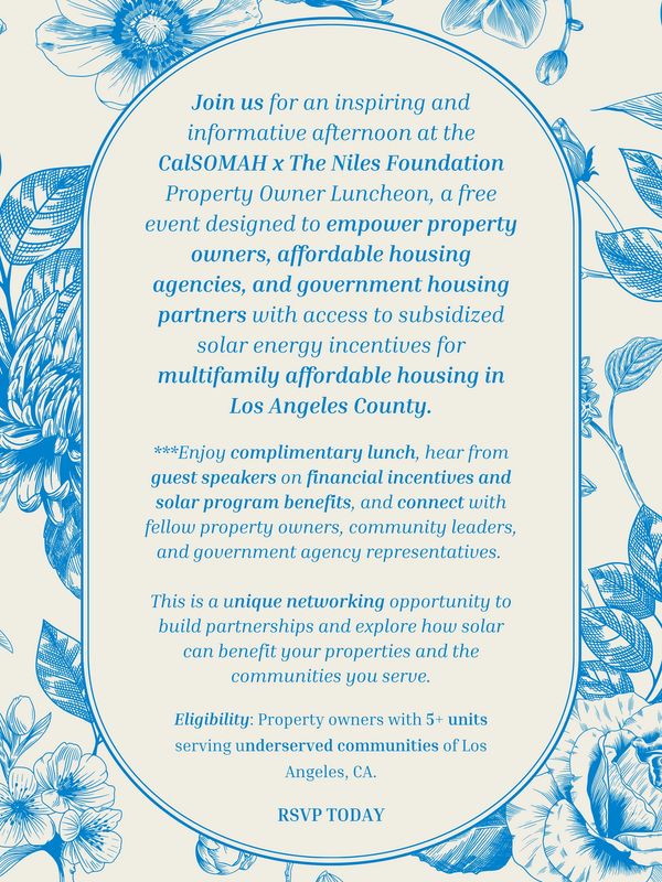 This is a Property Owners Luncheon designed for properties with at least 5+ units. This event will provide a complimentary lunch and present amazing financial incentives and benefits programs for subsidized solar on multifamily affordable housing in LA County.